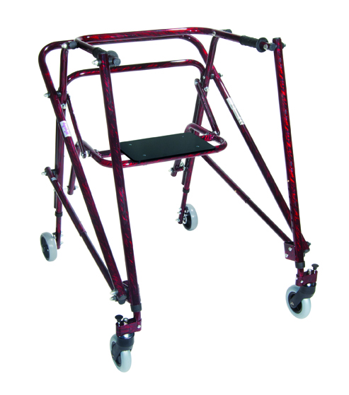 This Solid Seat for the Adult Nimbo Lightweight Posterior Posture Walker folds up for standing and walking and flips down for convenient seating. The seat can be mounted to or removed from the Adult Nimbo Posture Walker at any time.